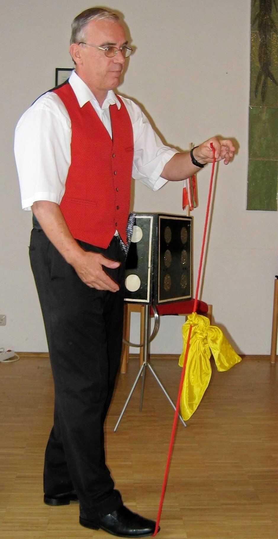 1. Partyzauberei oder "Salonmagie": Ab ca. 13 Personen, (für Familienfeiern und andere Gesellschaften) mit vielen Tücher, langen und kurzen Seilen, Chinesischen Ringen, Spielkarten, Stäben, einer Matrjoschka und anderen Dingen.